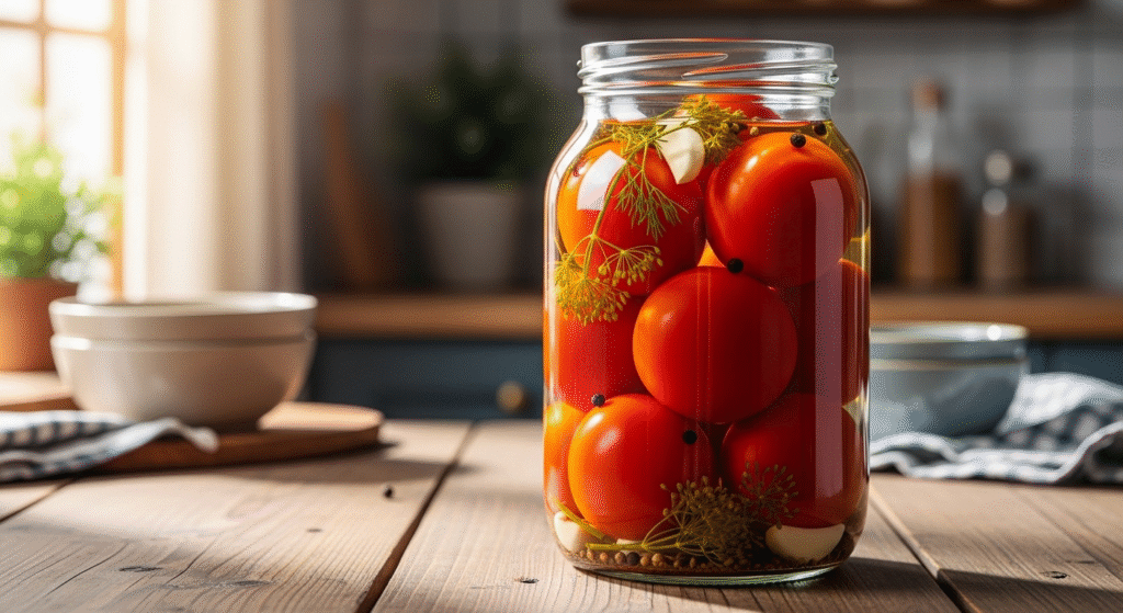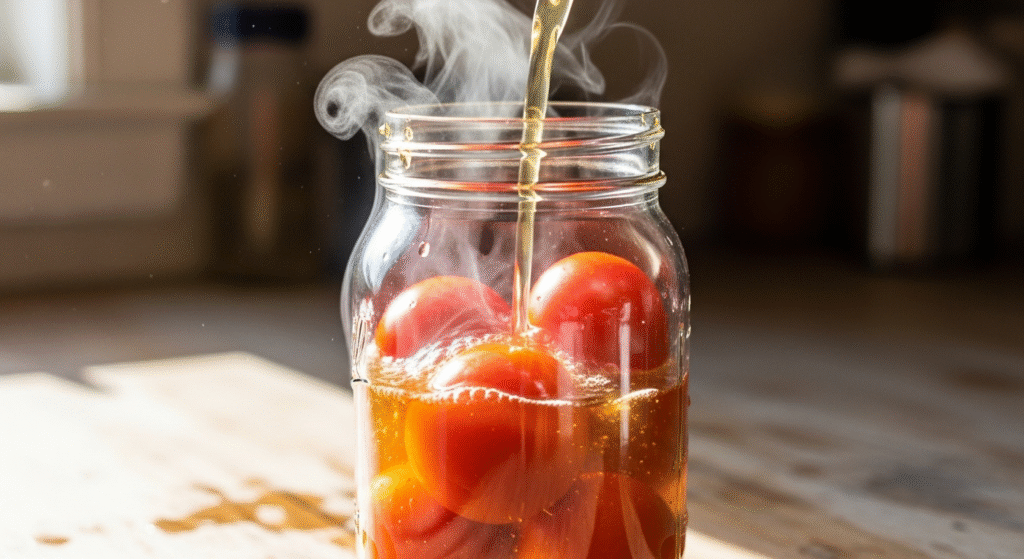 - Выложите помидоры в чистую стеклянную банку и залейте горячим маринадом.
