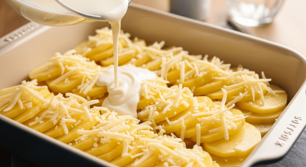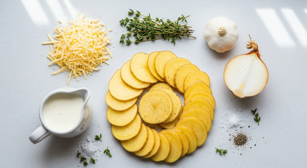 Нарежьте картофель очень тонко (мандолина или острый нож). Лук и чеснок мелко нарубите. Слой за слоем выкладывайте картофель, пересыпая луком и немного чеснока. Залейте сливками, посыпьте сыром и выпекайте при 180°C около 40–50 минут до румяной корочки.