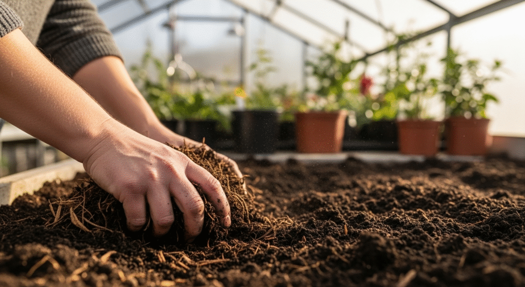 После уборки урожая аккуратно взрыхлите почву, удалите камни и внесите органические удобрения — компост или перегной. Такие добавки восстановят питательный баланс и улучшат структуру грунта. Затем слейте воду из шлангов и фильтров, чтобы избежать замерзания системы. Если в теплице установлено капельное орошение, снимите ленты и храните их в сухом помещении.