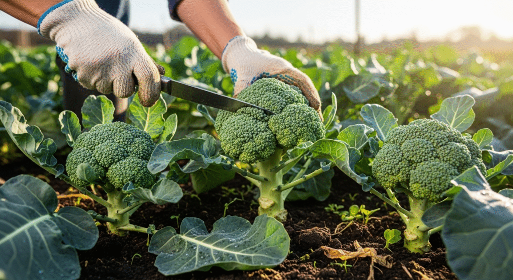 Свежая брокколи, растущая на солнечной грядке, готовая к сбору урожая.
