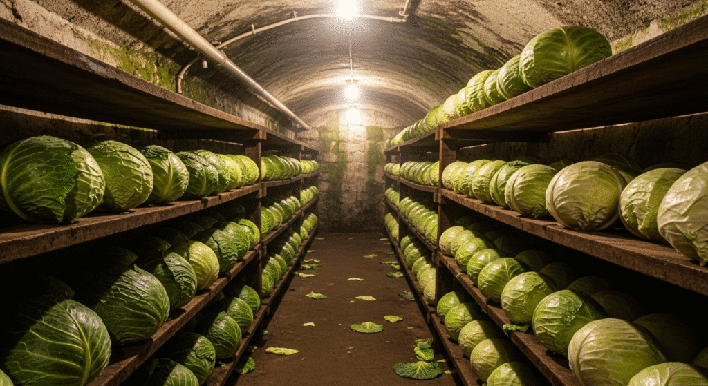Для хранения выбирайте прохладное место — подвал или погреб. Температура должна быть от 0 до +2 °C, влажность — около 90%. Важно обеспечить вентиляцию, чтобы воздух свободно циркулировал. Поэтому не складывайте кочаны слишком плотно. Также нельзя держать капусту рядом с фруктами, особенно с яблоками, так как они выделяют этилен и ускоряют порчу.
