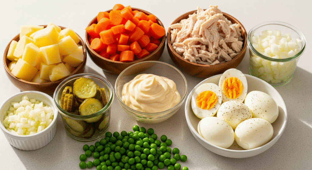 - Картофель — 3–4 средних шт. (отварить до мягкости).