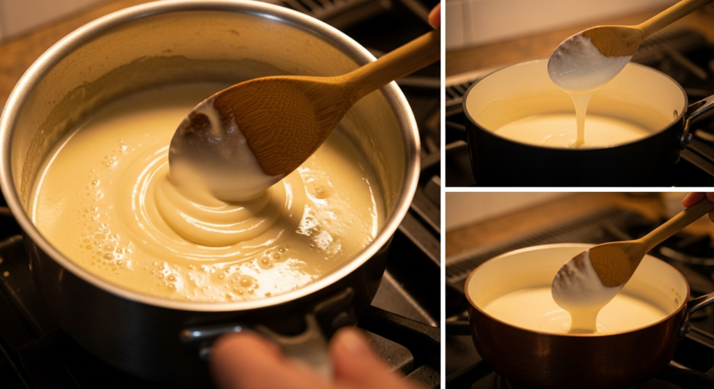 Сливочный соус — ключевой элемент блюда. На слабом огне растопите сливочное масло, добавьте сливки и аккуратно прогрейте, не доводя до кипения. Это важно, чтобы соус остался гладким и нежным. По желанию можно добавить мелко нарезанный чеснок или немного белого вина для аромата. В конце приправьте солью и перцем.