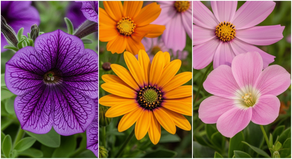 - Петуния — разнообразие оттенков и ампельные сорта для подвесных корзин.