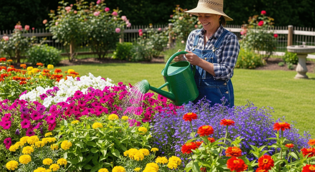 Для эффектного цветника используйте комбинацию растений с разной высотой, формой и цветовой гаммой. Низкорослые цветы лучше садить на переднем плане, а высокие — на заднем или в центре клумбы. Регулярный полив, подкормка и удаление увядших соцветий помогут сохранить яркость и здоровье растений.