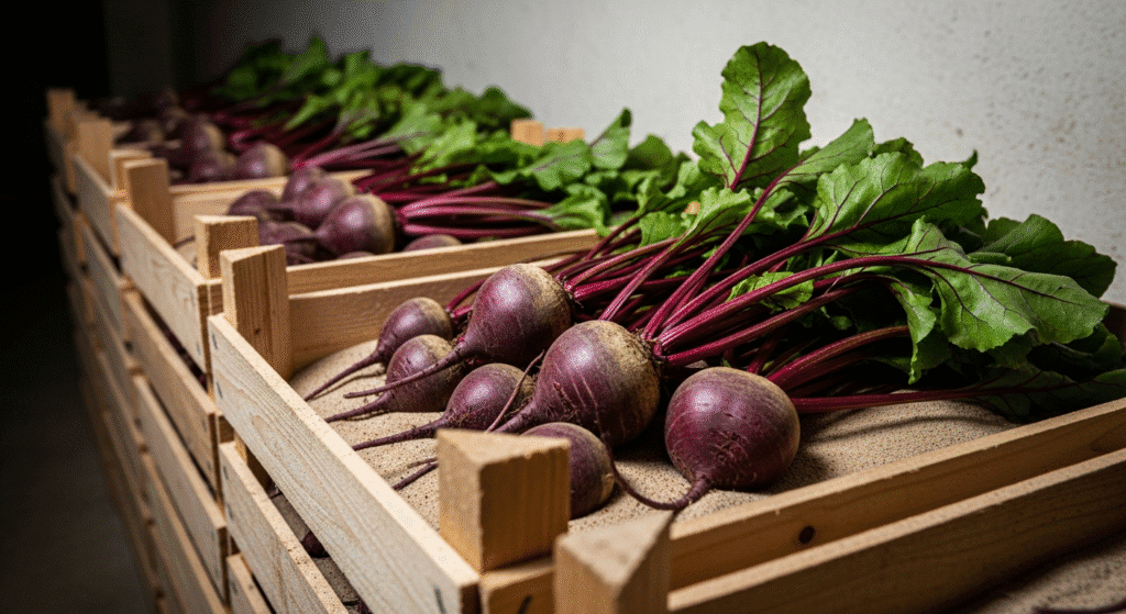 Оптимальная температура хранения — от 0 до +2°C. Поддерживайте влажность на уровне 90–95%. Благодаря этому свекла остаётся сочной. Лучше всего использовать ящики с влажным песком или опилками. Такой способ снижает пересыхание.