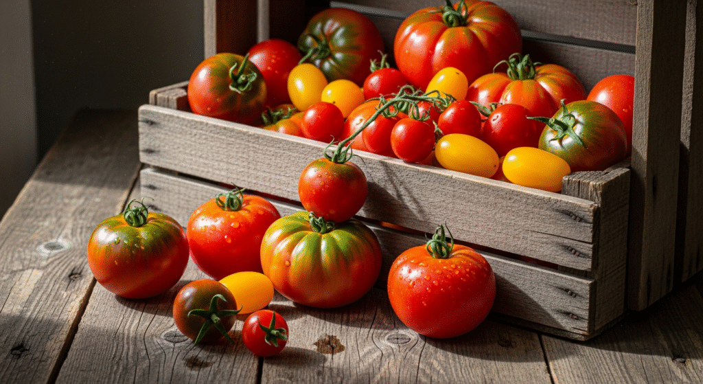 Собирайте плоды, когда они приобретают насыщенный цвет, но остаются плотными. Для длительного хранения лучше снимать томаты в стадии технической спелости — они дозреют в прохладном и тёмном помещении при +10…+12°C. Отбирайте только целые, без трещин и повреждений плоды. Разделяйте сорта при хранении, чтобы сохранить вкус и свежесть дольше.