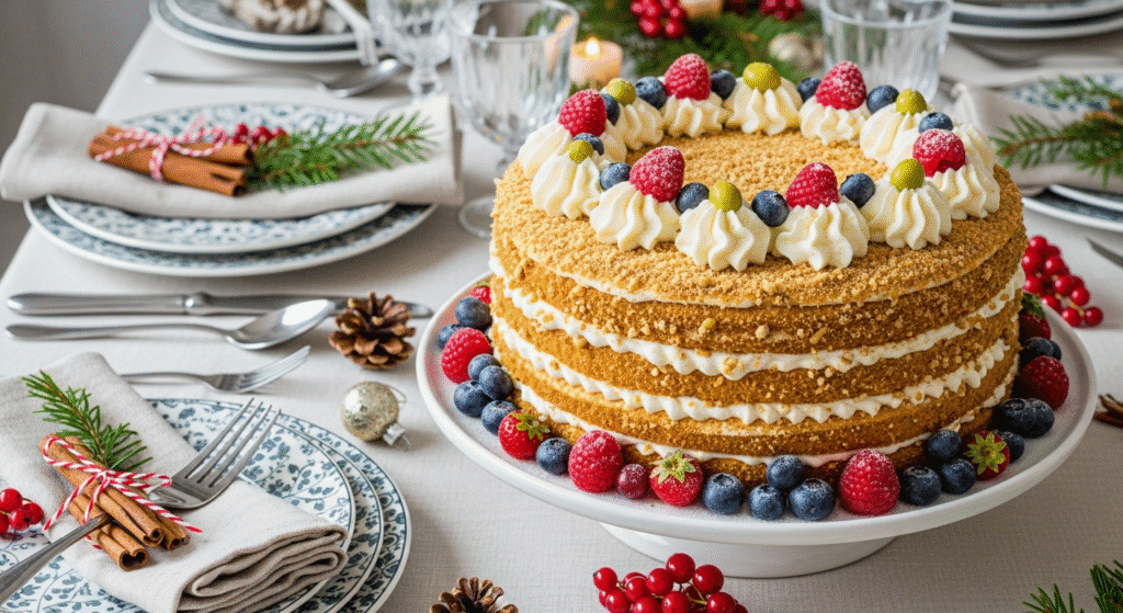 Медовик домашний, украшенный к празднику, готов к подаче на стол.