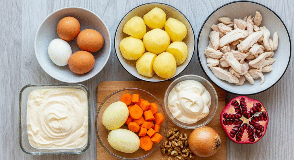 - Отварите и остудите курицу, картофель, морковь и яйца.