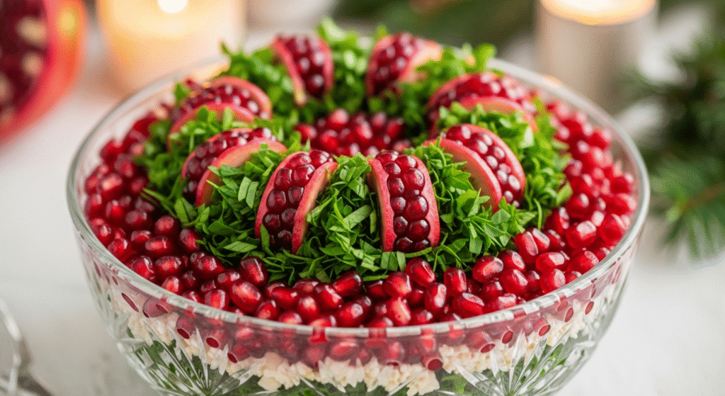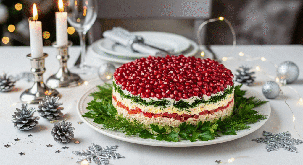 Готовый новогодний салат «Гранатовый браслет» на праздничном столе.