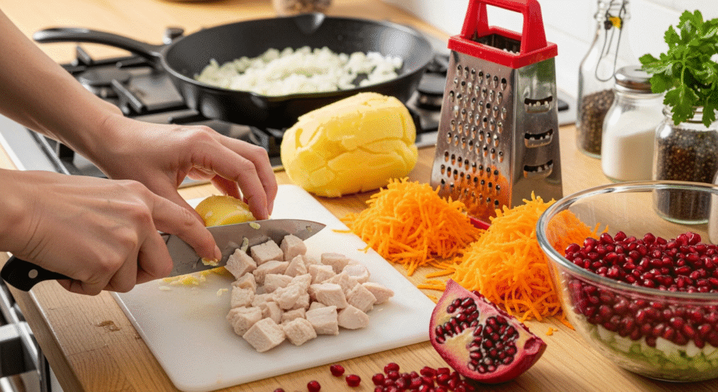 - Подготовьте все ингредиенты: мясо, овощи, яйца и гранат.