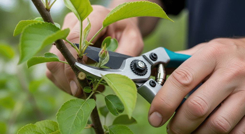 Удаляйте сначала больные, пересохшие и трущиеся ветви. Срезы делайте под углом над здоровым боковым побегом: это стимулирует рост в нужном направлении. Не оставляйте пеньков — обрез должен быть аккуратным и гладким. Соблюдайте гигиену: протирайте инструменты между срезами и обрабатывайте крупные раны садовым варом или медным раствором. Чрезмерная обрезка может ослабить дерево — лучше удалить меньше, но точнее.