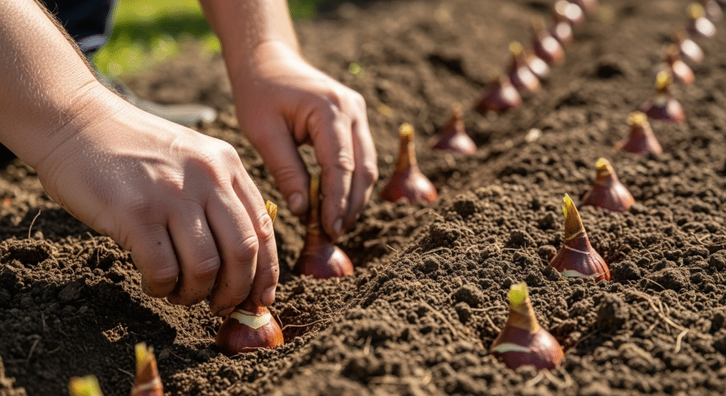 Глубина посадки зависит от размера луковицы. Обычно это 8–12 см. Между луковицами оставляйте 15–20 см, а между рядами — около 30–40 см.