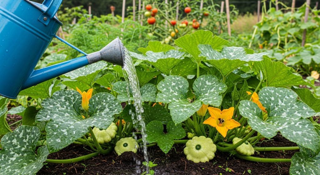 В период активного роста патиссоны нуждаются в регулярном поливе тёплой водой. Почва должна быть постоянно умеренно влажной. После полива рекомендуется рыхлить землю, чтобы улучшить доступ кислорода к корням.