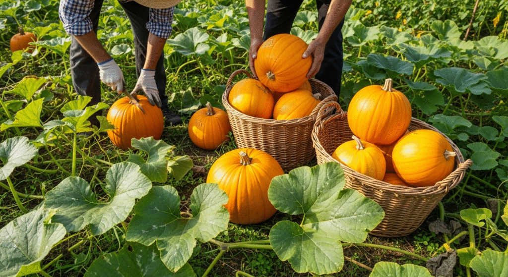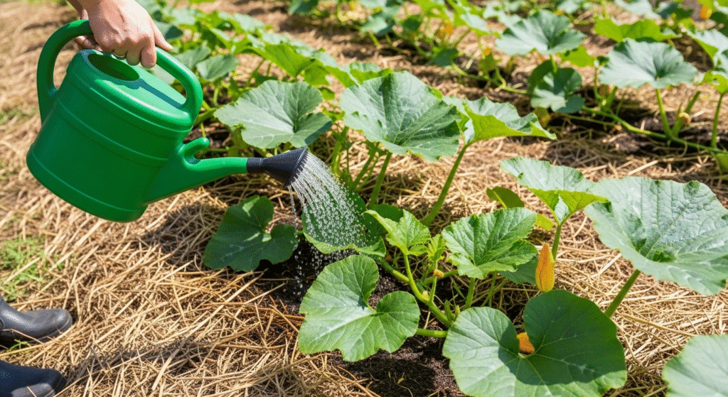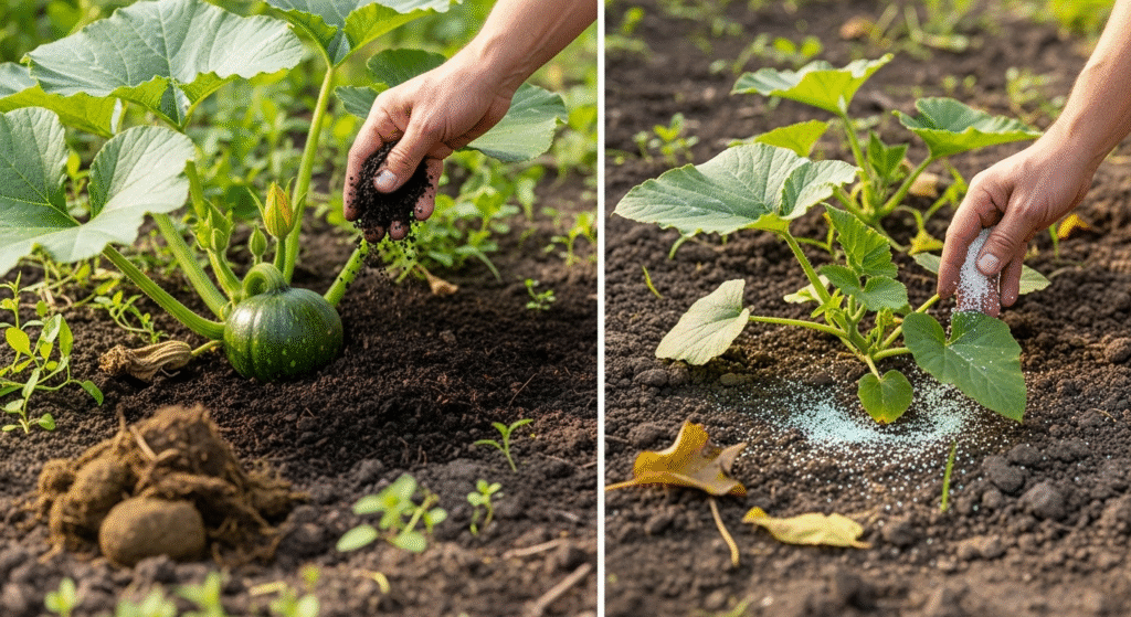 Для активного роста и формирования крупных плодов тыквы необходимо правильно подкармливать растения. На ранних этапах роста эффективны азотные удобрения, способствующие развитию зелёной массы. В период цветения и завязывания плодов применяют фосфорные и калийные подкормки, которые повышают урожайность и улучшают вкус тыквы. Также полезны органические удобрения: перегной, компост или перепревший навоз, которые обогащают почву питательными веществами и улучшают её структуру.